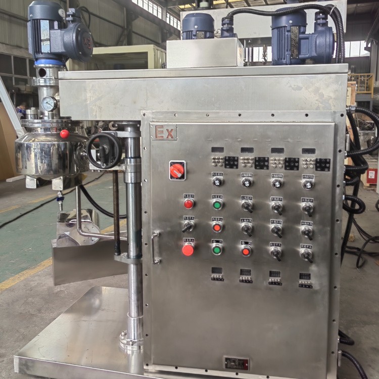 第三種是分散盤式溶解攪拌器,在均質乳化機的攪拌軸底端裝有一圓盤狀的攪拌器--分散盤攪拌器,由電機直接帶動,轉速為1400rpm。它的旋轉方向與刮板攪拌器相反。分散盤在攪拌軸上可上下移動調節,以達到更佳的效果。這種攪拌器攪拌時相當激烈,物料由中心向外翻騰,它的作用是迅速將新加入的組份潤濕混合和分散溶解到液體或膏狀物料中,它是一種剪切力很大的攪拌器,適合高粘度物料。它與均質乳化機的刮板攪拌器和膠體磨組合成另一形式的均質攪拌系統。