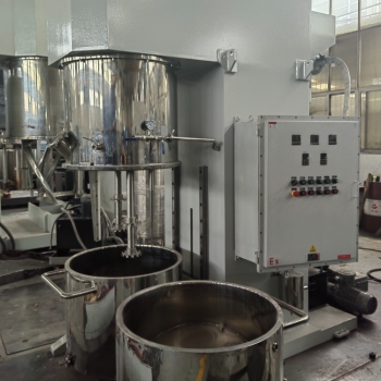 對于粘稠物料而言,雙行星混合攪拌機裝有低速攪拌部件和高速分散部件,低速攪拌部件采用行星式齒輪傳動,攪拌槳在公轉時也自轉,使物料上下及四周運動,從而在較短時間內達到理想的混合效果。而雙行星混合攪拌機的同速分散部件與行星架一起公轉,同時高速自轉,使物料受到強烈的剪切與分散混合,它的效果是普通混合攪拌機的幾倍。該雙行星混合攪拌機的分散部件分為單分散和雙軸分散,客戶可根據需要選擇適配。