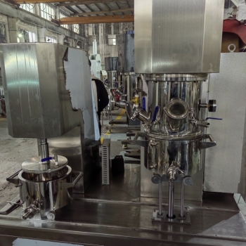 現階段常用的行星攪拌機通常有兩個低速檔大行星攪拌槳(通常為多斜漿葉式,大麻花式,框式),一個或2個快速大行星攪拌槳(分散化盤)和刮壁槳構成。